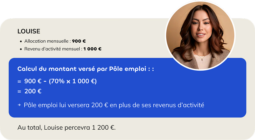 Pôle emploi déduit 70 % des revenus d’activités déclarés à l’Urssaf du montant mensuel de l’allocation. C’est le résultat de ce montant qui se cumulera aux revenus d’activité.